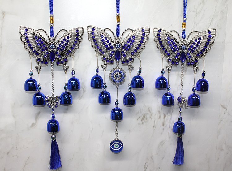 Metal Nazar Boncuğu Çan Model 7, kelebek figürü detaylarıyla zarif ve estetik bir tasarıma sahiptir. Geleneksel nazar boncuğu motifiyle birleşen bu model, kötü enerjileri uzaklaştırdığına inanılan güçlü bir dekoratif aksesuardır. Metal çanlarıyla ortama huzurlu bir tını yayarken, kelebek detayıyla doğanın zarafetini yansıtır. Kapı, pencere, bahçe veya duvara kolayca asılabilen bu ürün, uzun ömürlü ve dayanıklı metal malzemeden üretilmiştir. Hem iç mekan hem de dış mekan süslemesi için idealdir.
