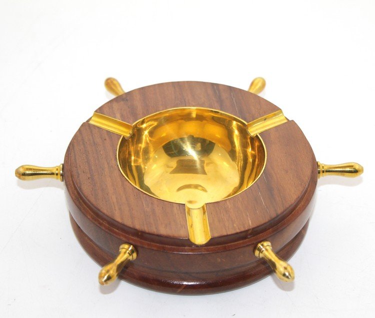 Pirinç dümenli küllük, şık tasarımı ve kaliteli işçiliği ile dikkat çeker. Bu dekoratif obje, ahşap ve pirinç birleşimiyle üretilmiştir. Ahşap yüzeyi ve pirinç dümen figürüyle denizcilik temalı bir tasarıma sahiptir. Hem şık hem de fonksiyonel bir obje olan bu küllük, dekorasyon amaçlı kullanılabileceği gibi hediye olarak da idealdir.